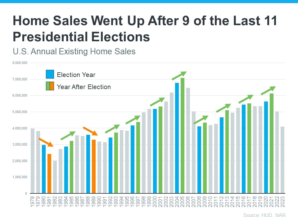 In fact, data from the Department of Housing and Urban Development (HUD) and the National Association of Realtors (NAR) shows after nine of the last 11 Presidential elections, home sales went up the next year (see graph below):