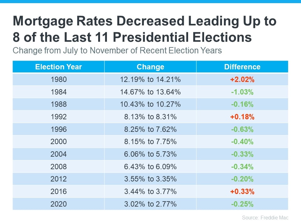 Mortgage rates are important because they affect how much your monthly payment will be when you buy a home. Looking at the last 11 Presidential election years, data from Freddie Mac shows mortgage rates decreased from July to November in eight of them (see chart below):