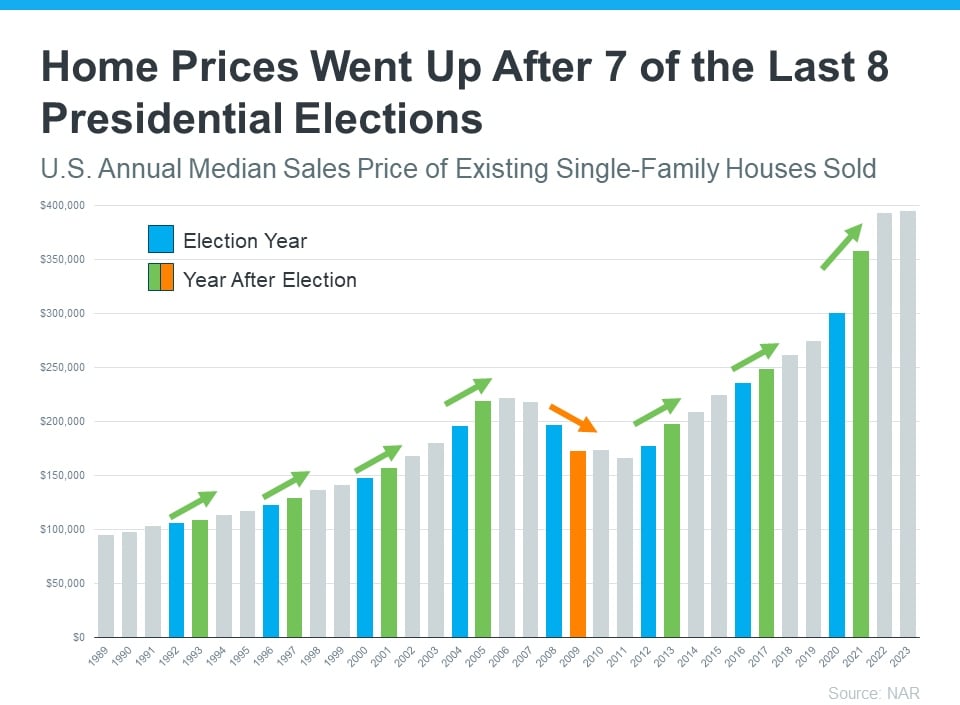 Home prices are pretty resilient. They generally rise year-over-year, regardless of elections. The latest data from NAR shows after seven of the last eight Presidential elections, home prices increased the following year (see graph below):