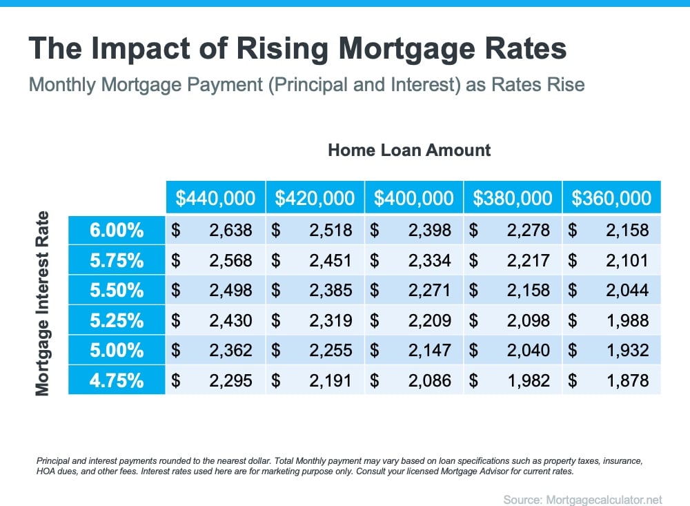 Mortgage rates play a significant role in your home search. As rates go up, they impact how much you’ll pay in your monthly mortgage payment, which directly affects how much you can comfortably afford. Here’s an example of how even a quarter-point increase can have a big impact on your monthly payment (see chart below):