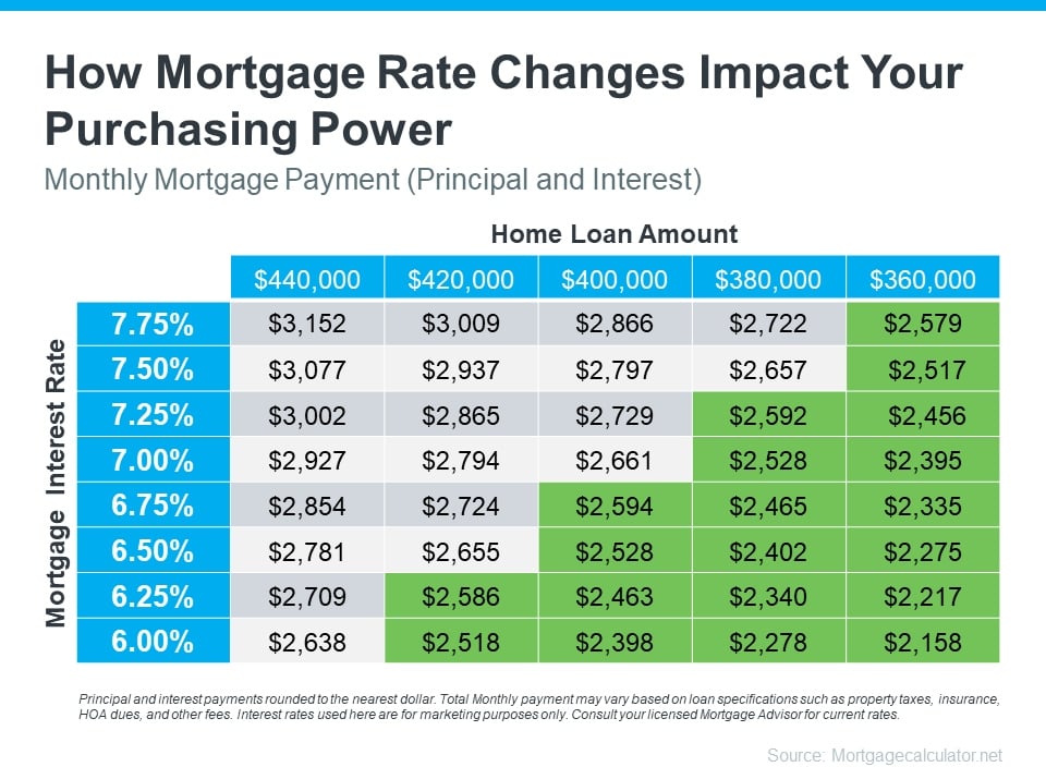 Take this chart as an example. It gives you an idea of how mortgage rates impact your monthly payment when you buy a home. Imagine being able to make a payment between $2,500 and $2,600 work for your budget (principal and interest only). The green part in the chart shows payments in that range or lower based on varying mortgage rates (see chart below):